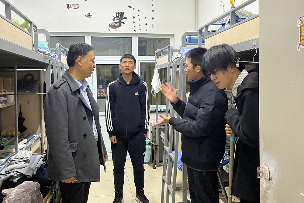 走访中,李培硕对员工宿舍生活设施、卫生和安全隐患等情况进行了察看,并与同学们进行了亲切、深入的交流,面对面了解同学们的思想、生活、学习等情况,一一给予关切的问候。在教室,与22级员工进行了交谈,询问了他们的学习情况,给予了学习上的建议。