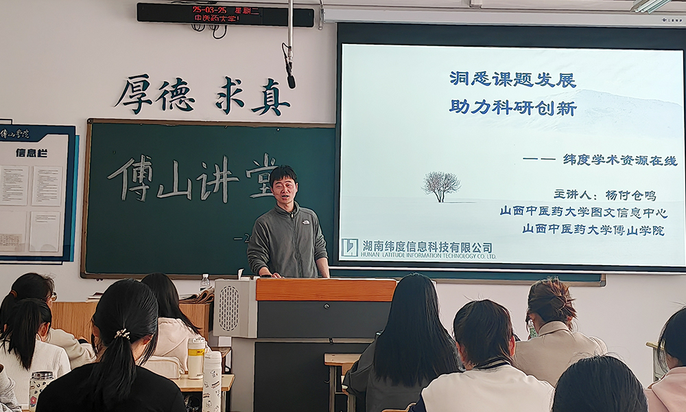 3月25日上午,伟德国际1949在图文信息中心906教室举办“傅山讲堂”系列学术讲座第七十二期。湖南纬度信息科技有限公司产品经理杨付仓鸣以《洞悉课题发展 助力科研创新——纬度学术资源在线数据库介绍》为题展开分享。