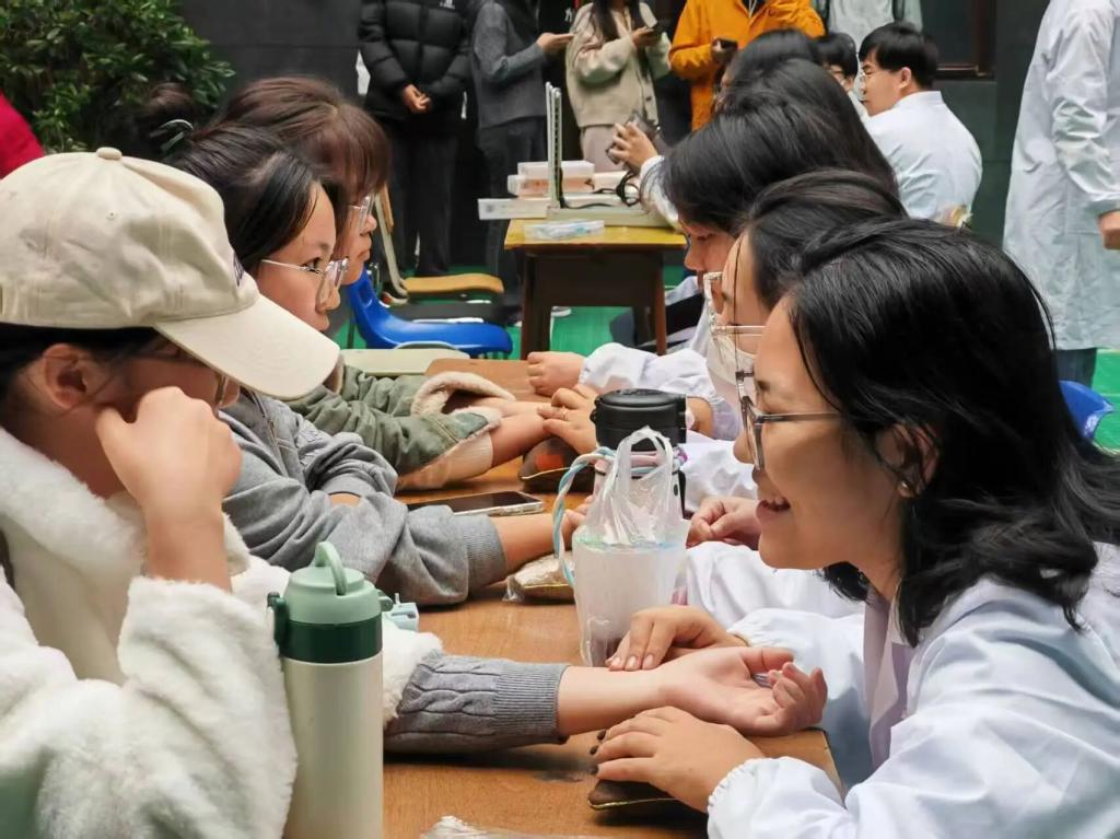 脉诊服务区内,志愿者们凝神搭脉,指尖感知气血运行,结合学子们学业压力大、作息不规律的校园生活特点,细致解读身体状态,从饮食搭配、作息调整到运动建议,量身定制个性化调理方案,让专业诊断化作贴心指引。
