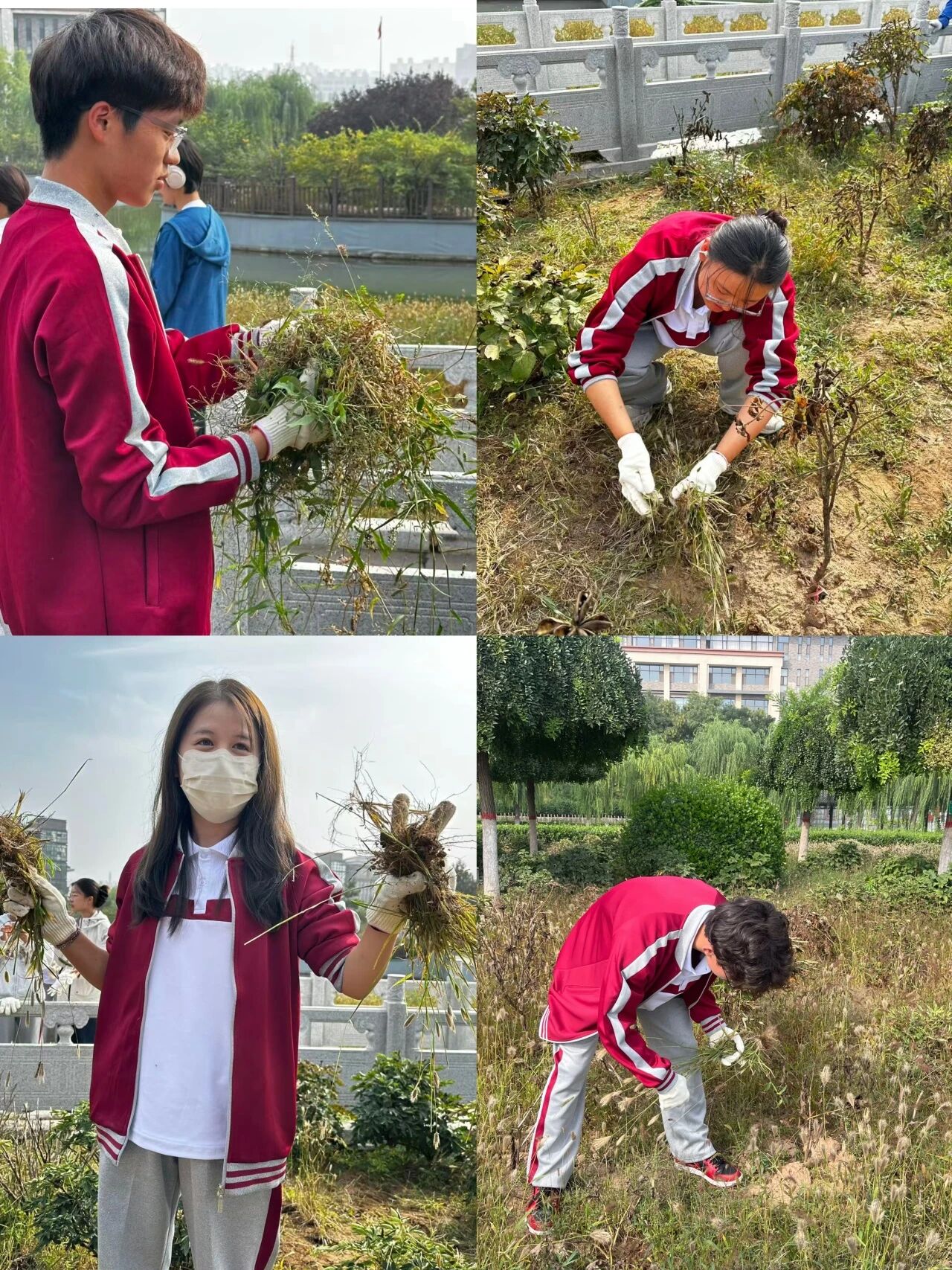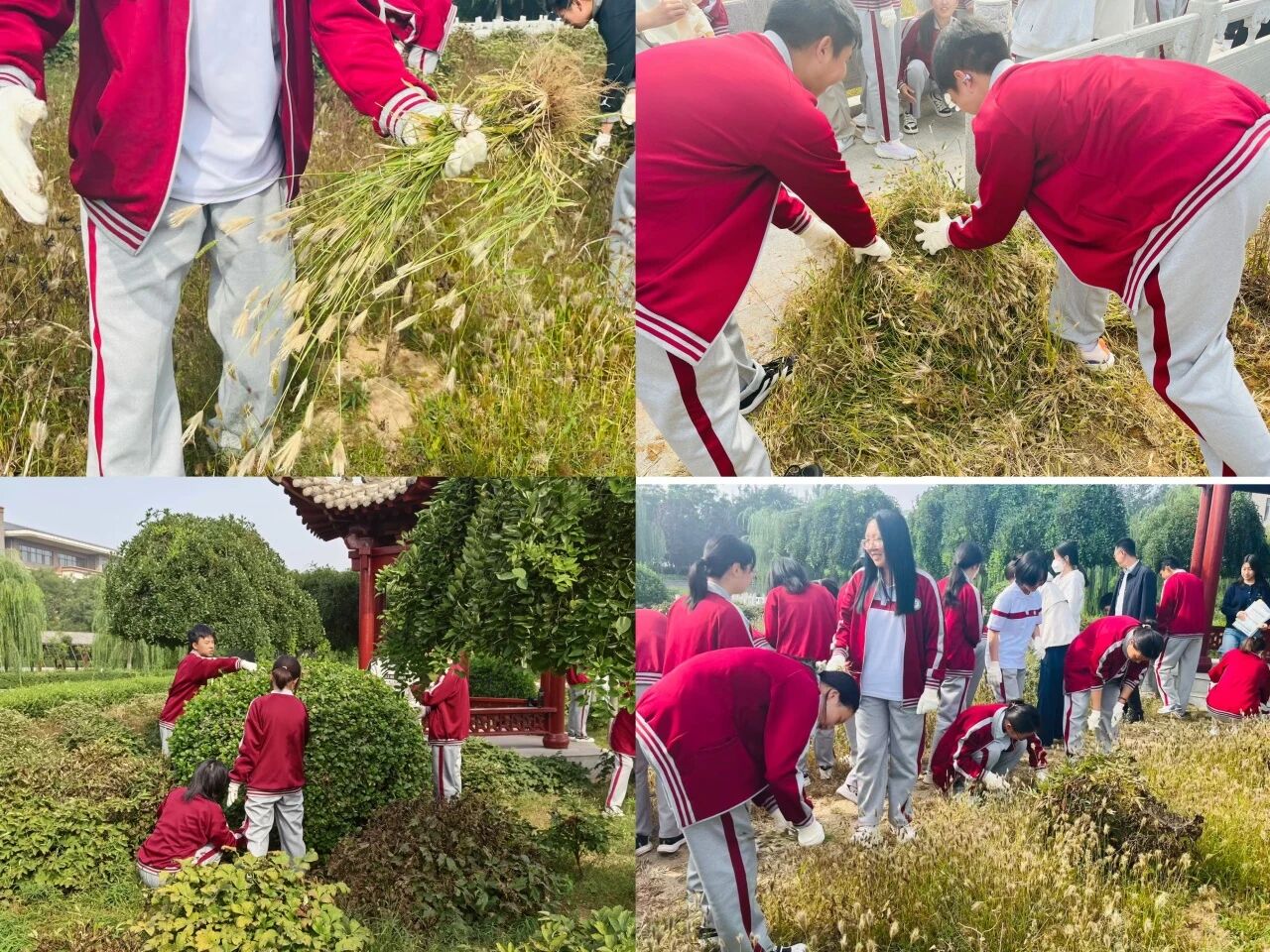 同学们在绿化工人的指导下,对亭子周围杂草进行清理。各班同学分工合作,热火朝天的投入到劳动实践中。大家俯身劳作,认真拔草的身影是在以实际行动践行“劳动最光荣”的理念。