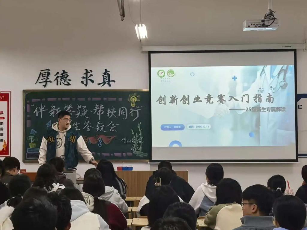 23级董顺发学长以亲身参赛经历为切入点,为新生系统讲解老员工创新创业大赛全流程与深层意义,他从“赛事选择与组队技巧”“项目选题与方案撰写”“路演准备与答辩技巧”三个维度展开,结合传统方剂改良、中医养生产品研发等中医药领域创新案例,解读如何将专业知识与创新创业思维结合,强调参赛能提升综合能力、拓宽专业视野、积累职业竞争力,鼓励新生尽早树立创新意识,积极参与科创赛事,为老员工活增添更多可能性。